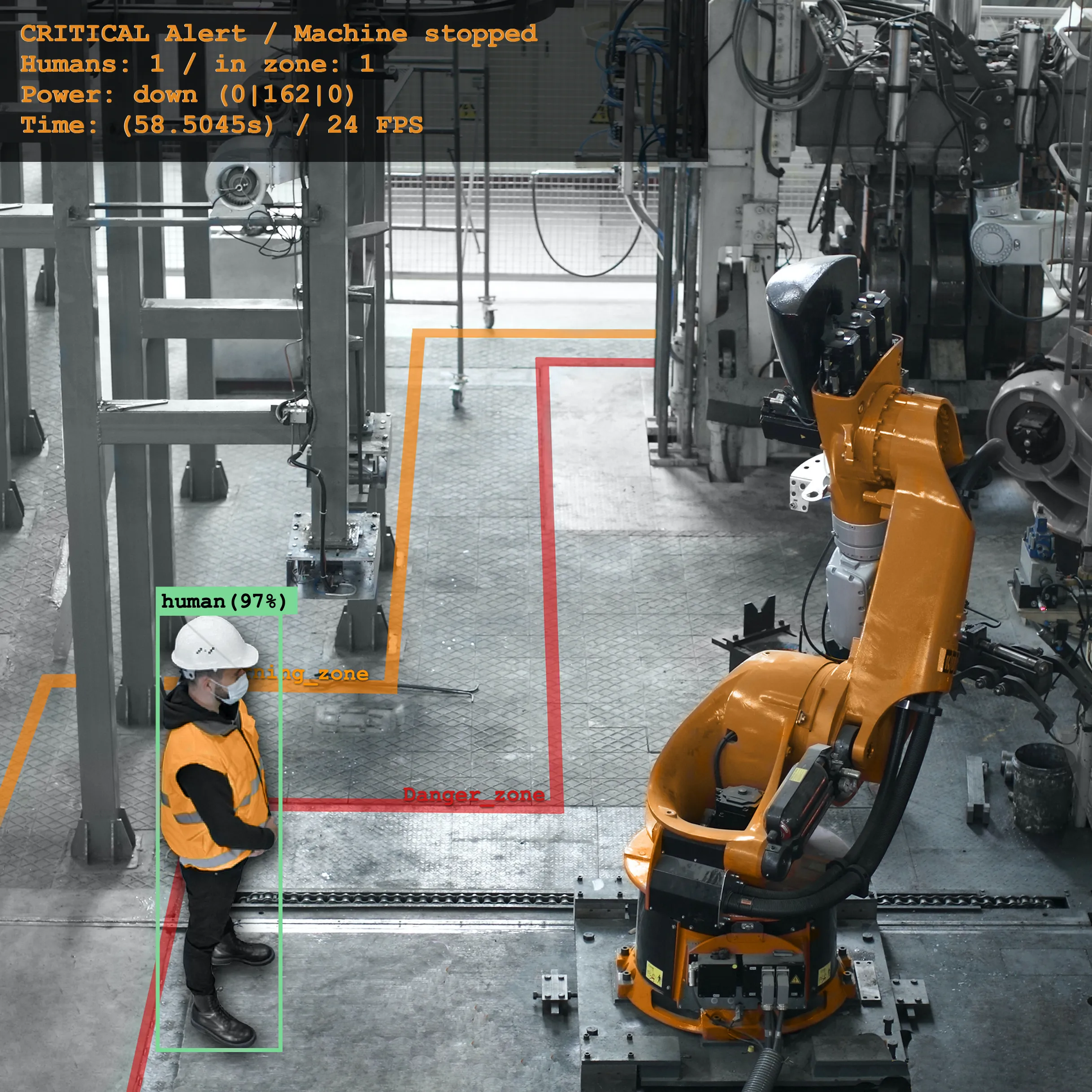 A certified AI-based safety system with the ability to detect dangerous situations around industrial machinery and respond immediately.