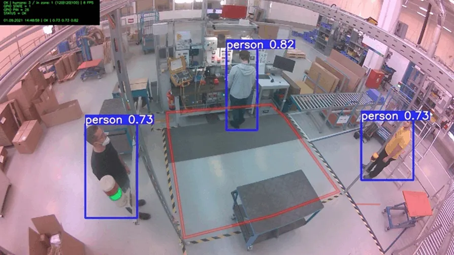 The above uses Invanta's highly innovative machine vision-based technology. The digital camera signal is fed onto the field bus of a dedicated processor running a neural network. This evaluates the area being monitored and activates the security system when a person or even just a body part is detected. As in any workplace, the basic safety rules and principles for the site must be followed.