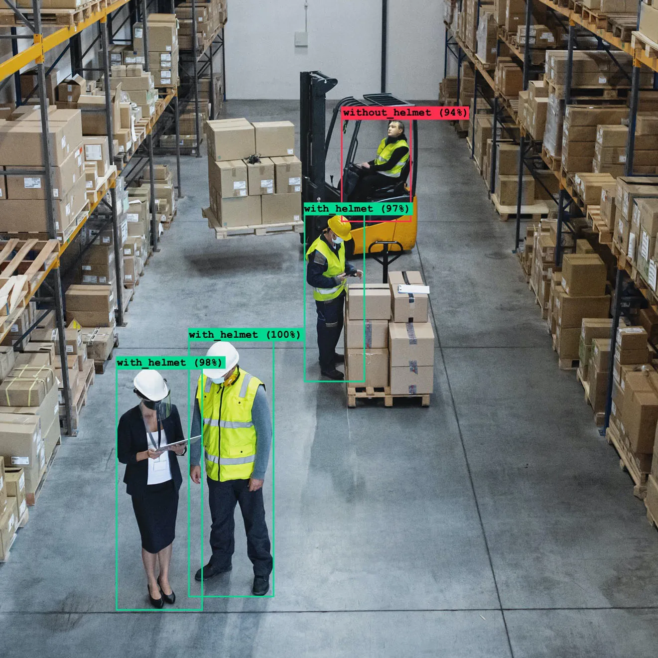 Our safety system is able to recognize if proper personal protective equipment is in place or not. In case of significant non-compliance corresponsive action can be triggered like notification, warning sound, deactivating sources of noice, keeping machine inactive until the proper PPE is place etc.